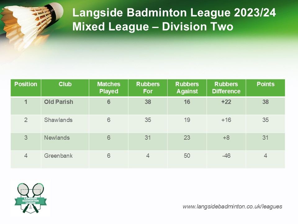 Final League Standings 2023/24 Keegan May 1, 2024 Uncategorized Langside League Standings 2023/24 - 2nd Mixed Division Image 3 of 6 Post navigation Previous Previous post: Nearing the end of the 23/24 season…Next Next post: Launching the 2024/25 season of the Langside Badminton League