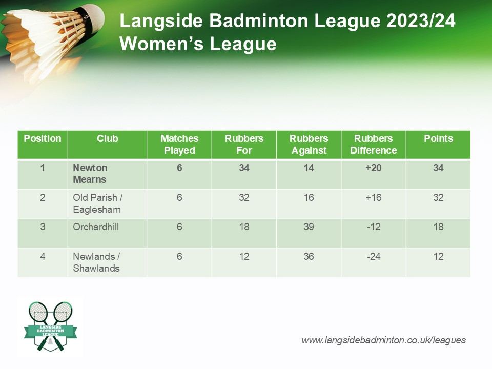 Final League Standings 2023/24 Keegan May 1, 2024 Uncategorized Langside League Standings 2023/24 - Women's Doubles Division Image 4 of 6 Post navigation Previous Previous post: Nearing the end of the 23/24 season…Next Next post: Launching the 2024/25 season of the Langside Badminton League
